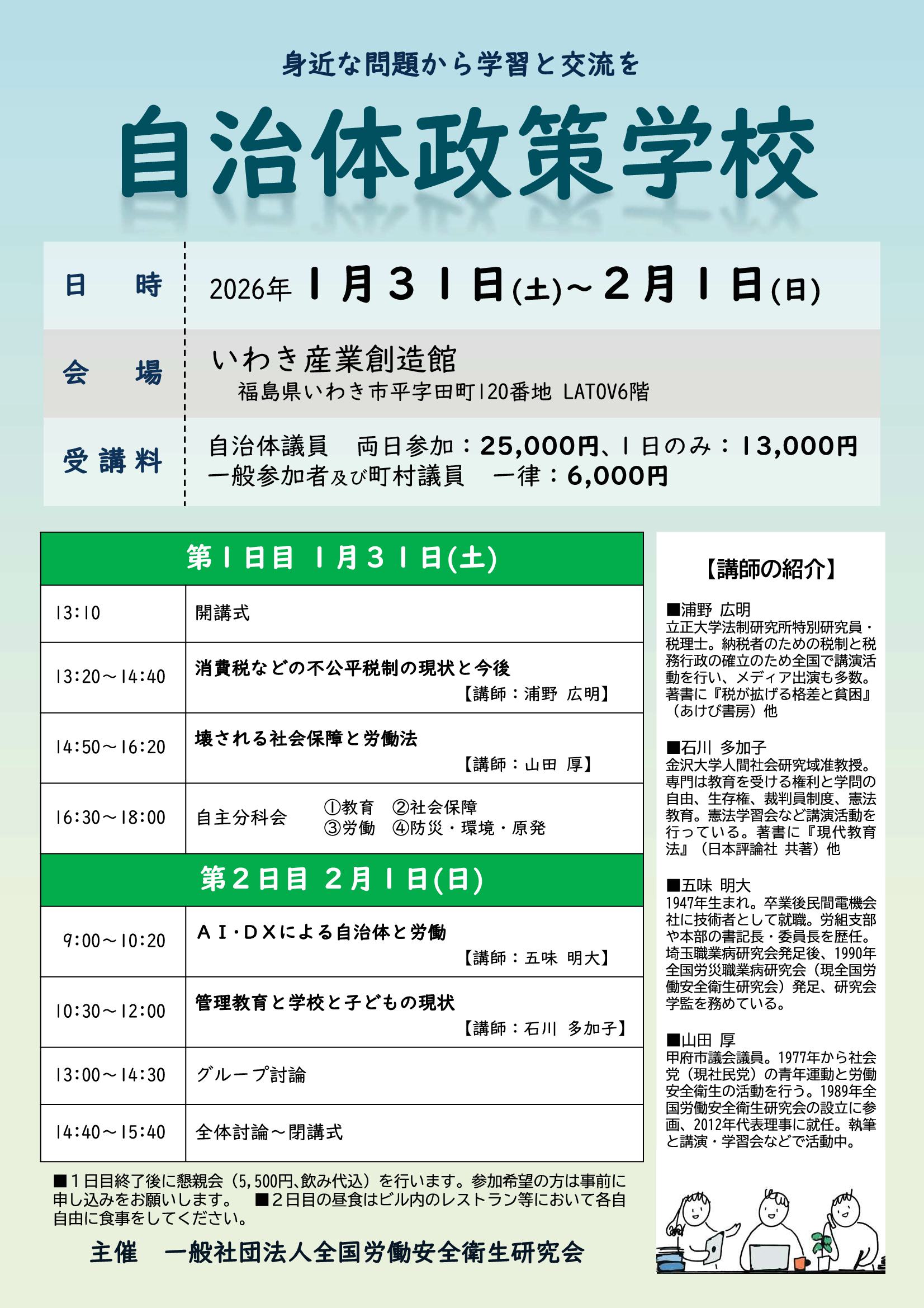 『働き方改革と労働安全衛生』を学校テーマに、2017年10月28日(土)~10月29日(日)青森市 青森労働福祉会館で第26期の全国労働安全衛生学校を開催しました。参加者はフタッフも入れると100名を超えました。そのうち自治体議員さんが十数名参加してくれました。
