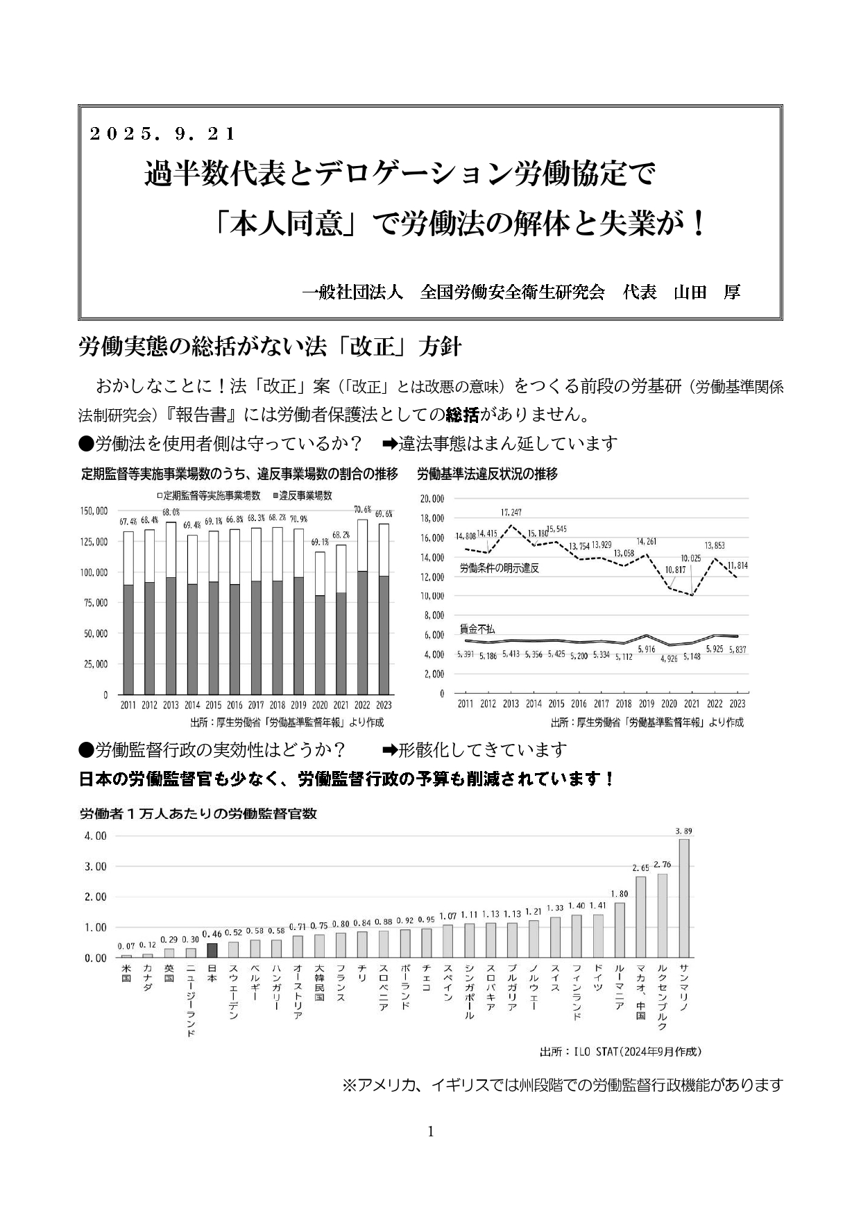 また、「明文」としましたのは、すでに職場・労働現場では、すでに「なし崩し的」に改悪がはじまっており、法文章を変えることで、さらに本格的に権利破壊を先に進ませようとしているからです。